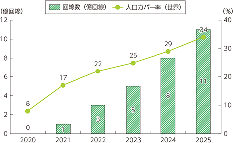 5Gは2020年の実現を目指し、世界各国で取組が進められている。グローバルの携帯電話事業者による業界団体GSMAによれば、2020年以降世界の5G回線数は、約5年で11億回線、世界人口に対するカバー率は約3割に達すると予測している(図表3-3-4-1)